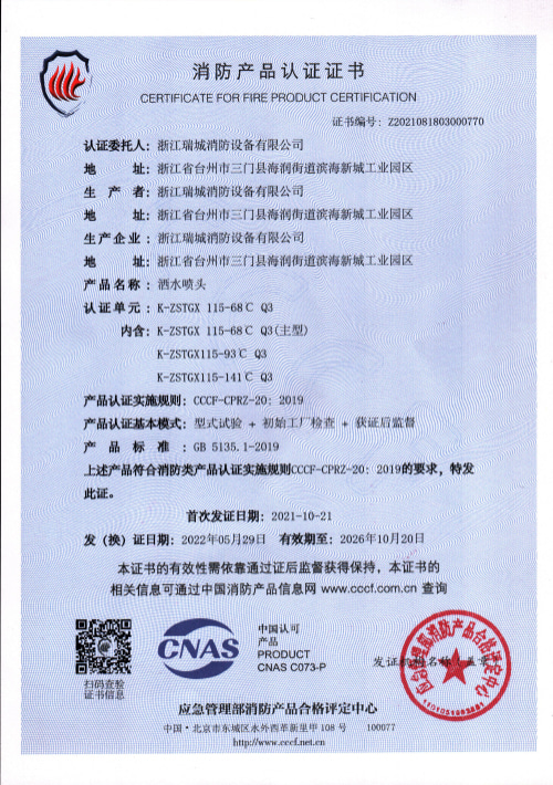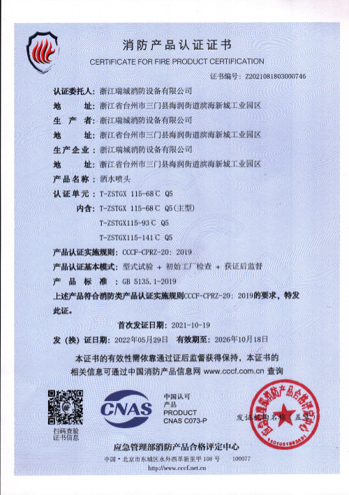 产品标准:GB5135.1 《自动喷水灭火系统 第1部分:洒水喷头》