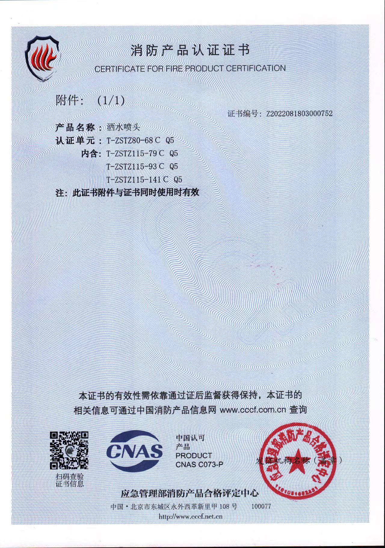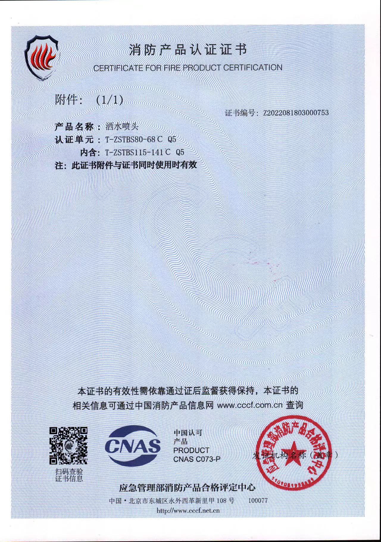 产品标准:GB5135.1 《自动喷水灭火系统 第1部分:洒水喷头》