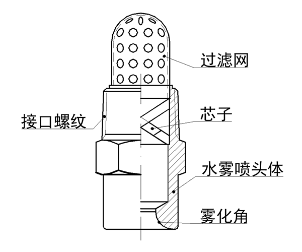 该系列水雾喷头是进水口和出水口在一条直线上的离心雾化喷头,它将一定压力的水流分解成两股水流,一股是沿内壁运动而具有离心速度的旋转水流,另一股是具有轴向速度的直水流、两股水流在喷头的喷口处汇合,以其合成速度由喷口喷出而形成细小的雾滴,喷出的水雾比较均匀,按照一定的雾化角均匀地喷射到被保护对象的外表面上,以达到防护冷却或扑灭火灾的目的。