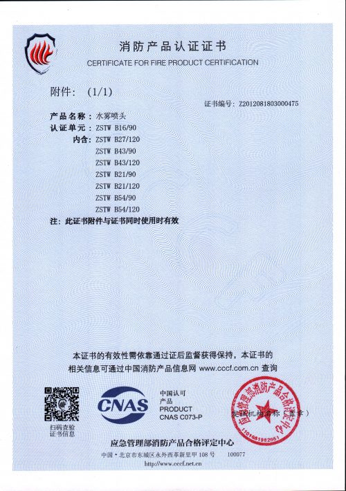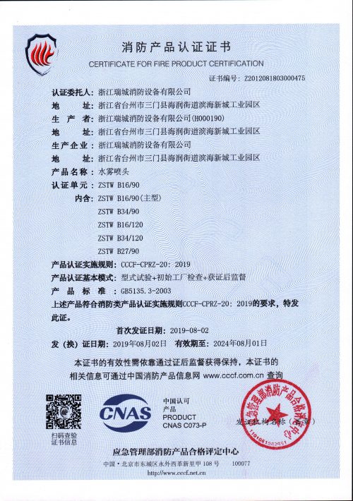 产品标准:GB5135.3《自动喷水灭火系统 第3部份:水雾喷头》