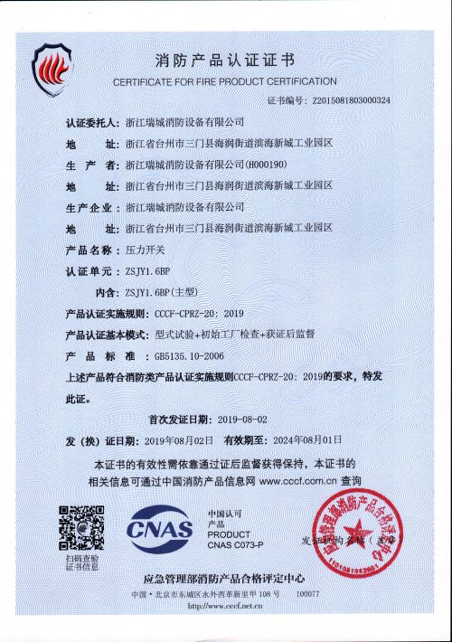 产品标准:GB5135.10《自动喷水灭火系统 第10部分:压力开关》
